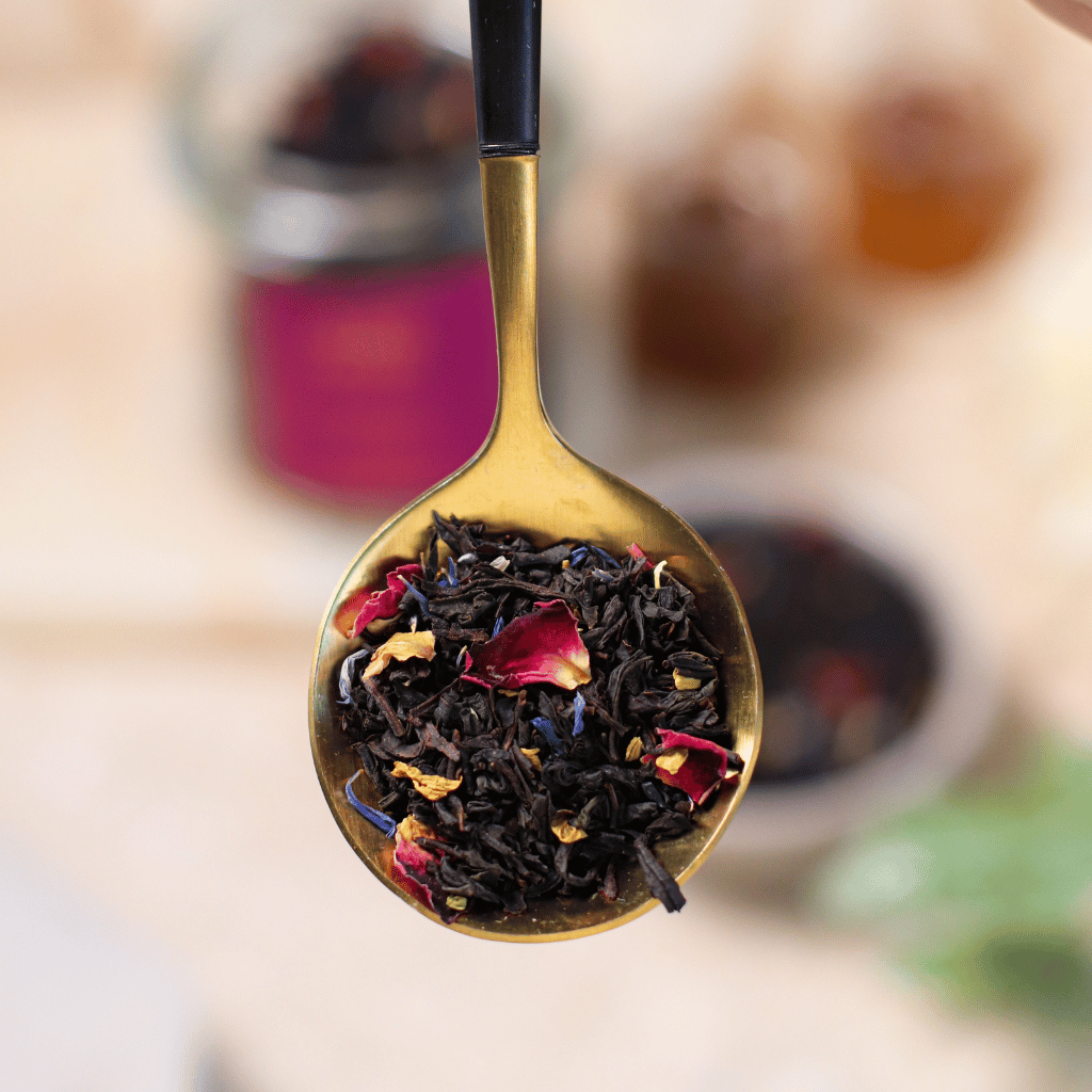 Herbata czarna, aromat, płatki róży, kwiaty słonecznika, kwiaty bławatka.