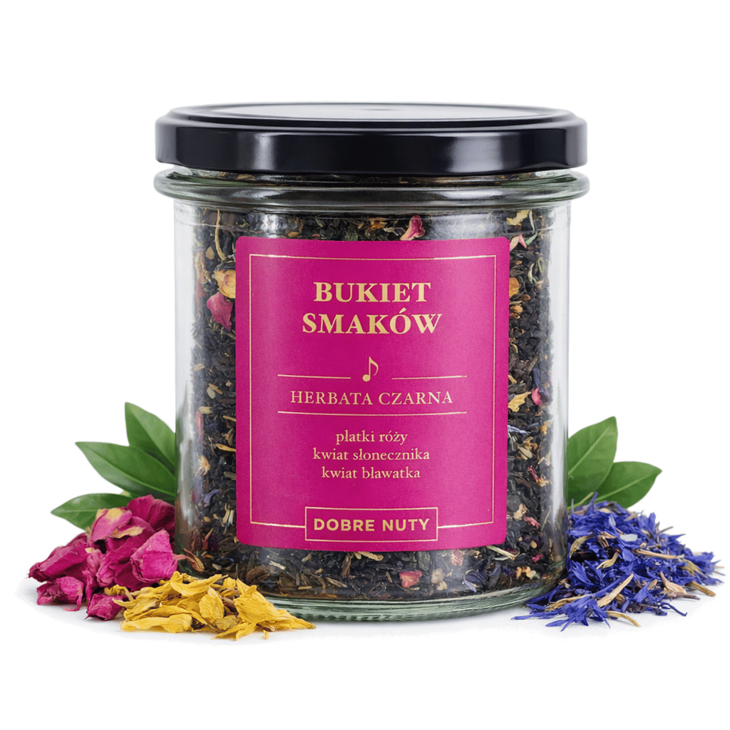 Bukiet Smaków to energetyczne połączenie klasycznej czarnej herbaty z egzotyczną nutą mango i marakui. Głęboki, wyrazisty smak naparu doskonale komponuje się z tropikalną słodyczą owoców, tworząc harmonijną całość, która pobudza zmysły i dodaje energii na cały dzień.