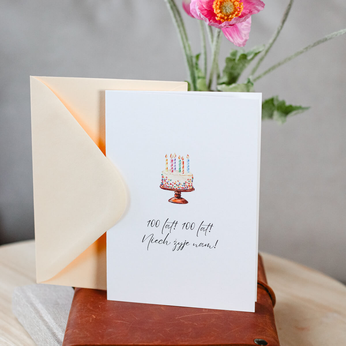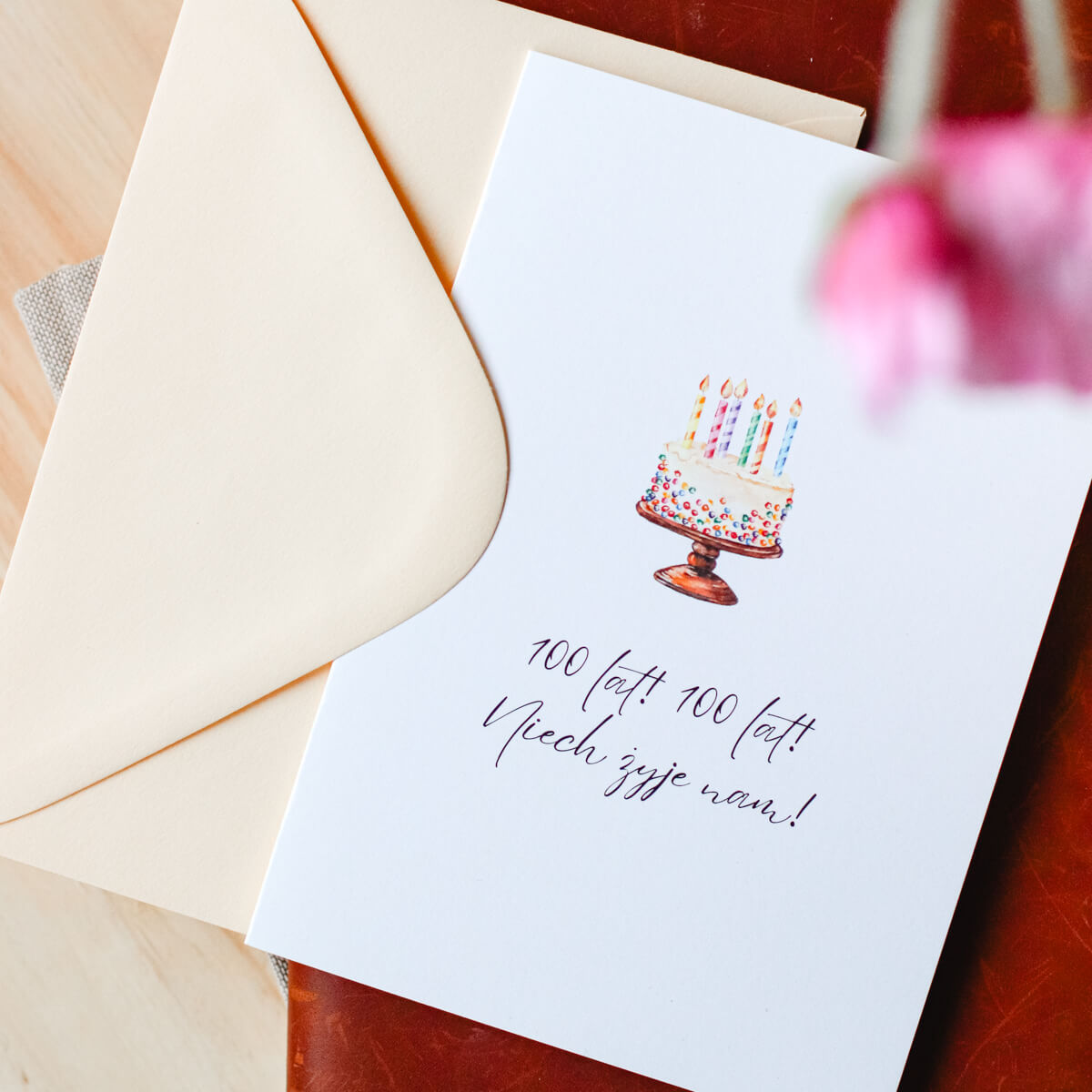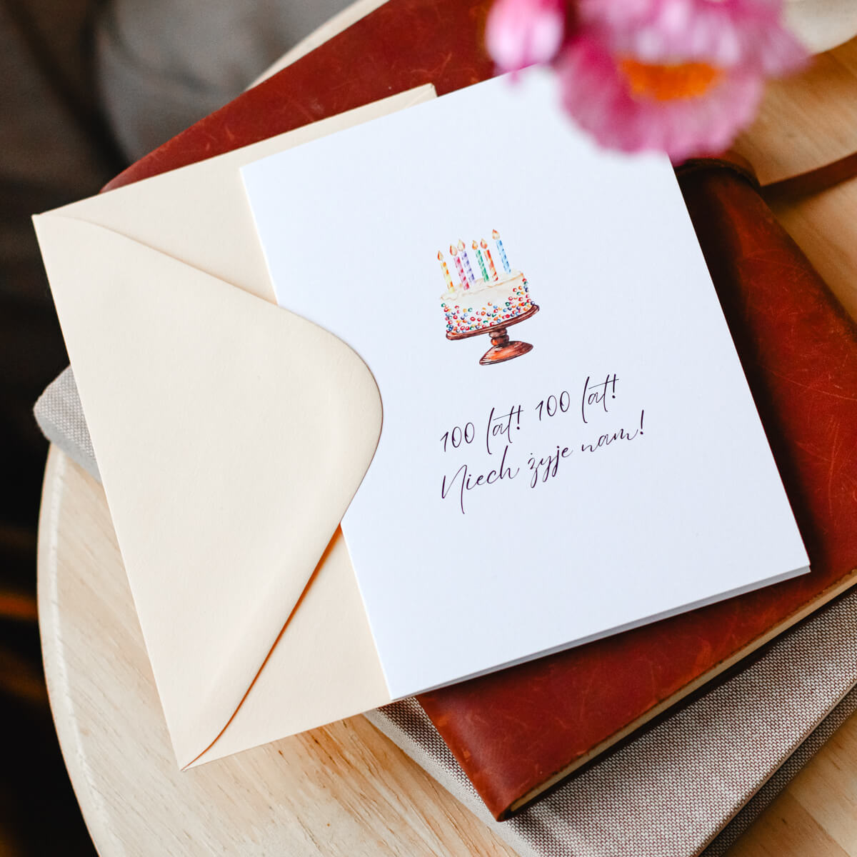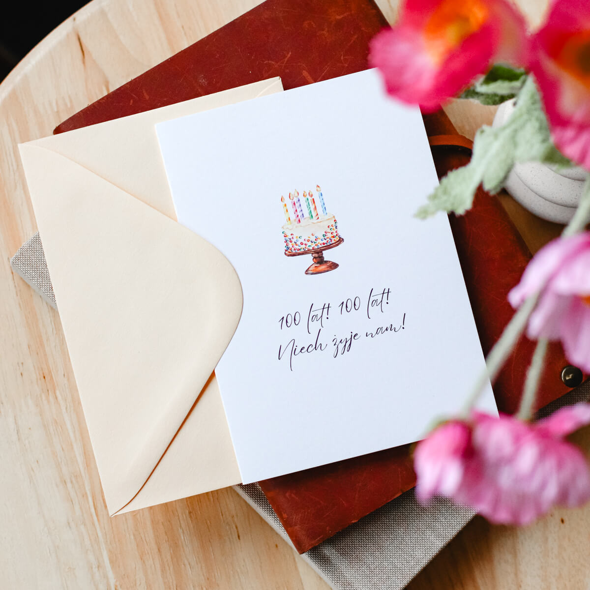 Karnet okolicznościowy z tortem i napisem „100 lat! 100 lat! Niech żyje nam!”. Minimalistyczny wzór, idealne dopełnienie urodzinowego prezentu.