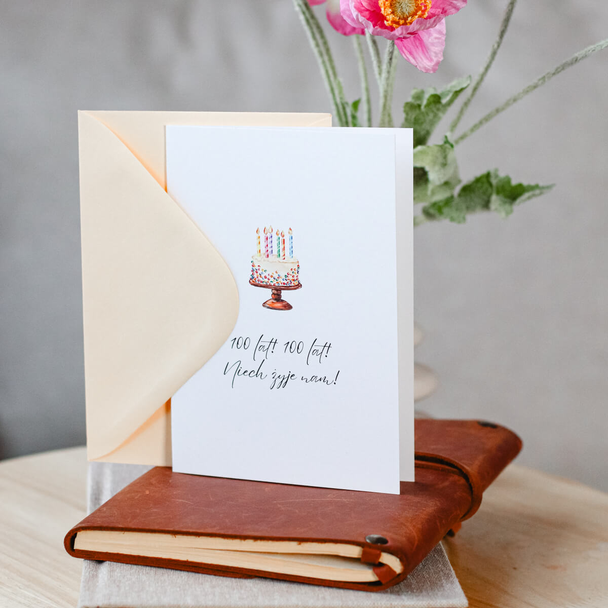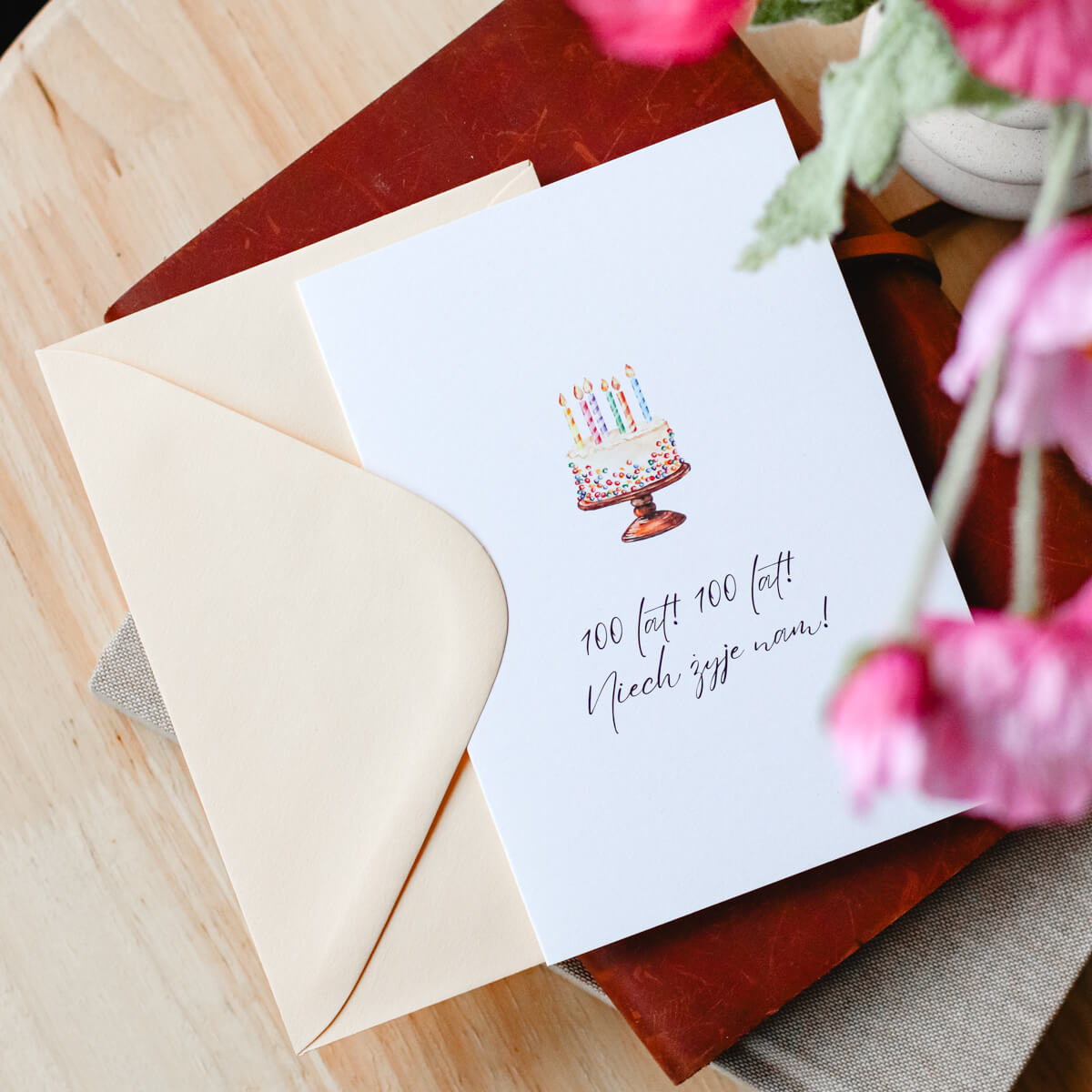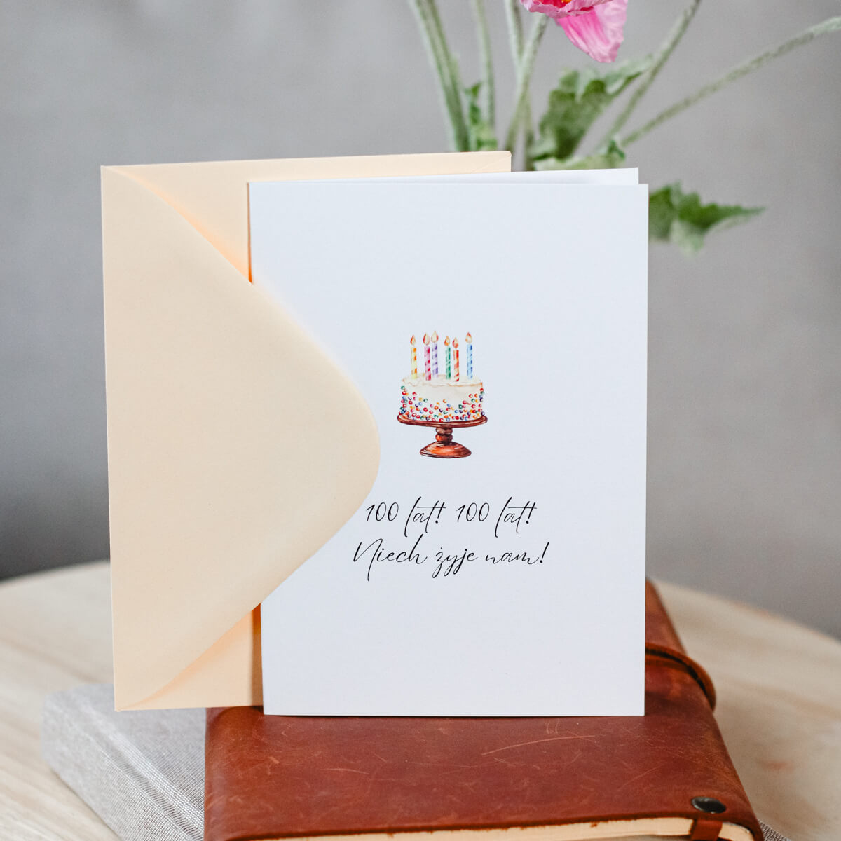 Karnet okolicznościowy z tortem i napisem „100 lat! 100 lat! Niech żyje nam!”. Minimalistyczny wzór, idealne dopełnienie urodzinowego prezentu.