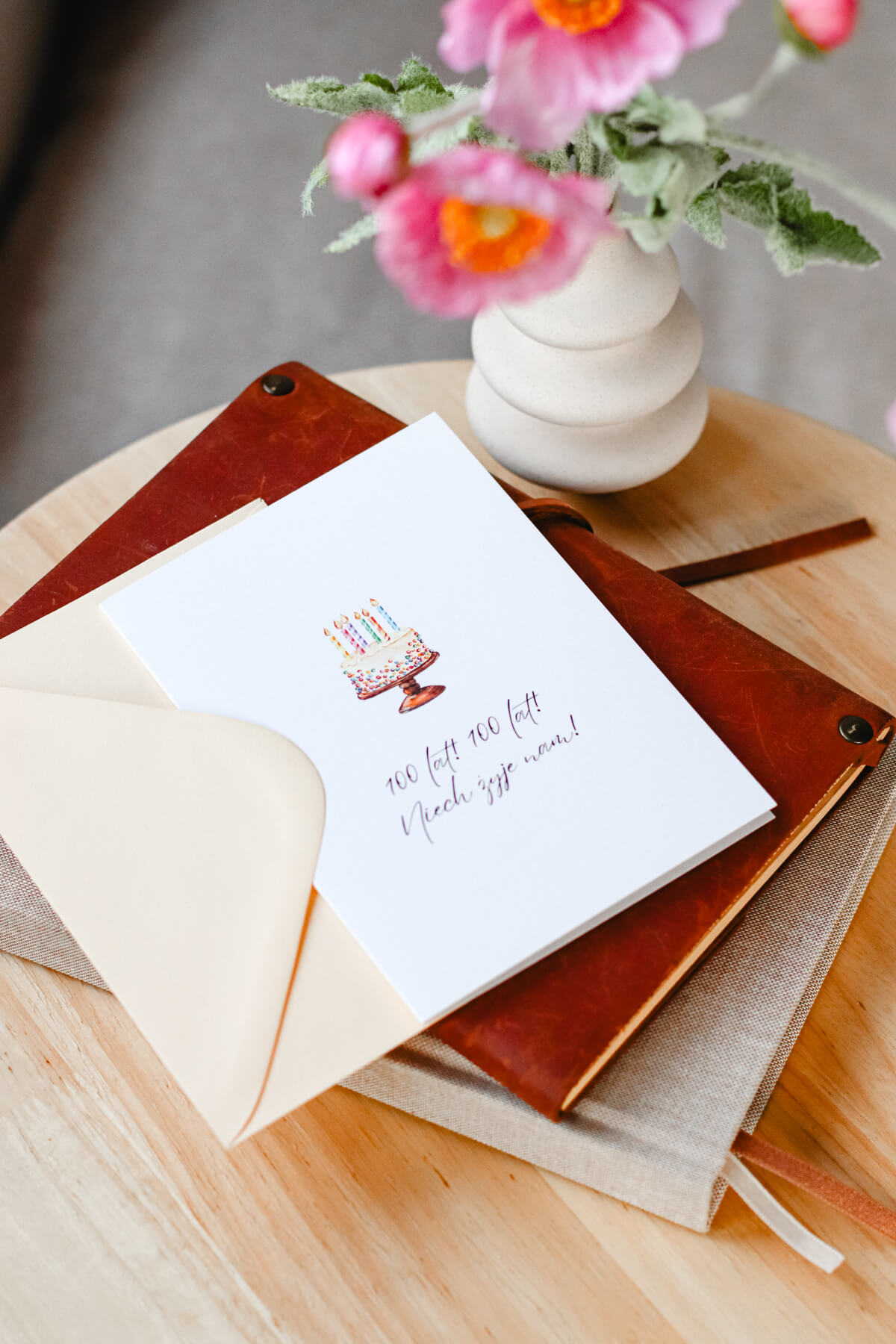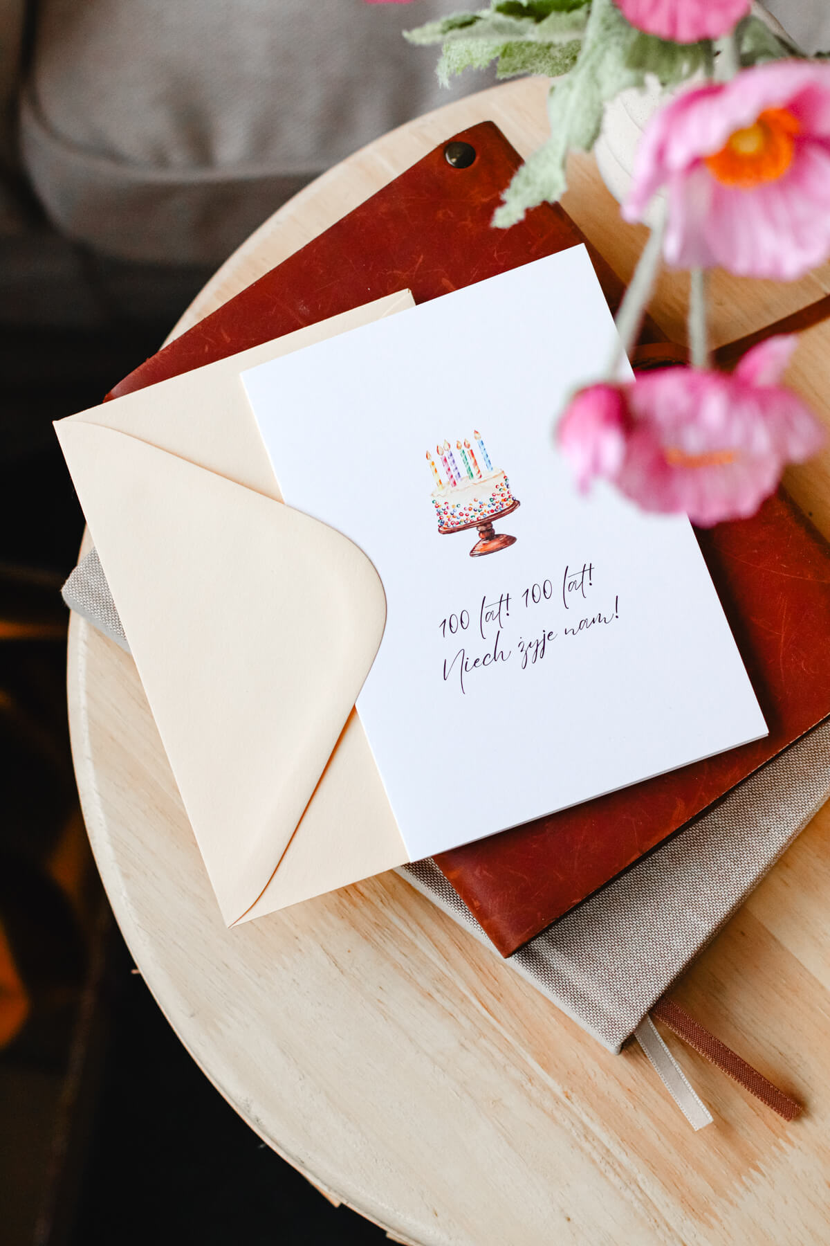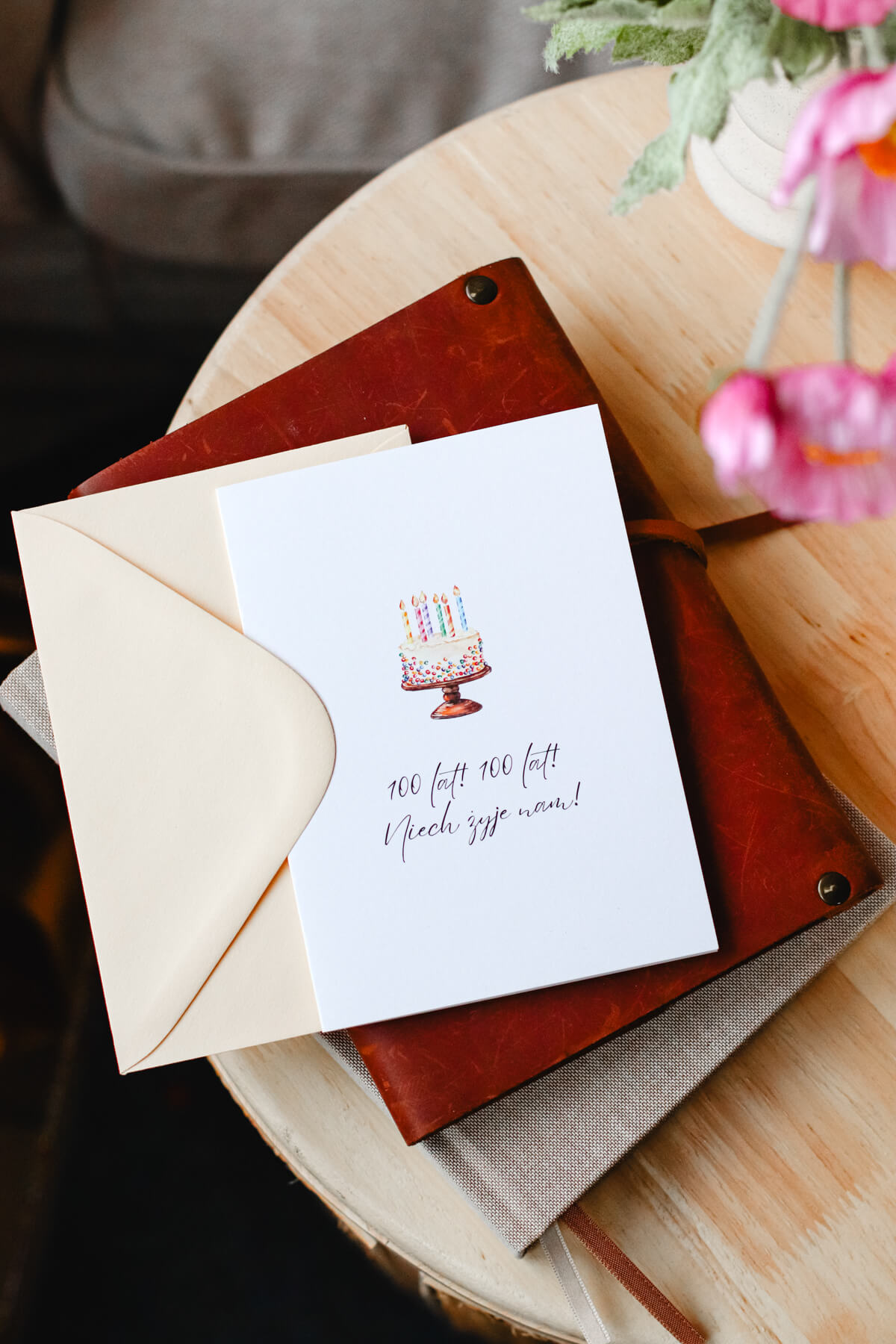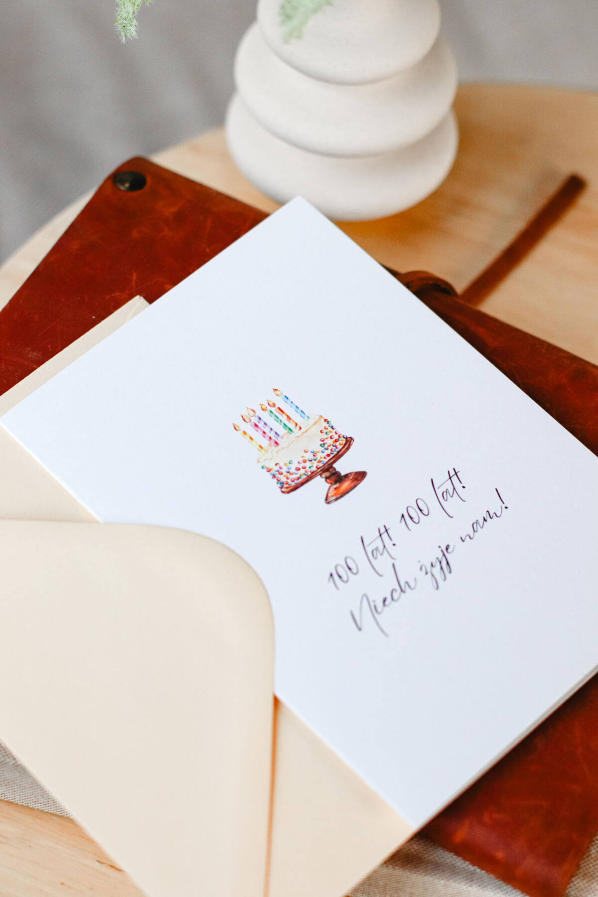 Karnet okolicznościowy z tortem i napisem „100 lat! 100 lat! Niech żyje nam!”. Minimalistyczny wzór, idealne dopełnienie urodzinowego prezentu.