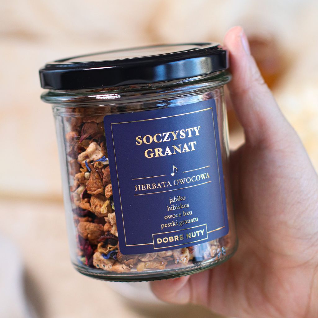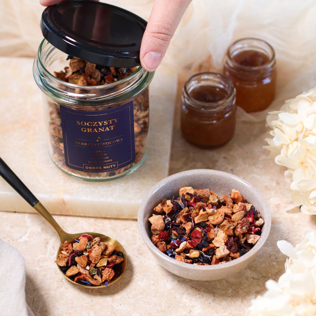 Pozwól sobie na chwilę przyjemności z filiżanką intensywnie owocowej herbaty o smaku soczystego granatu. To wyjątkowa kompozycja starannie dobranych owoców i kwiatów, która zachwyca głębokim rubinowym kolorem, bogatym aromatem oraz naturalną słodyczą przełamaną delikatną, orzeźwiającą kwasowością. Każdy łyk naparu przenosi w świat letnich, dojrzałych owoców i daje przyjemne uczucie rozgrzania w chłodne dni lub doskonale gasi pragnienie podana na zimno.