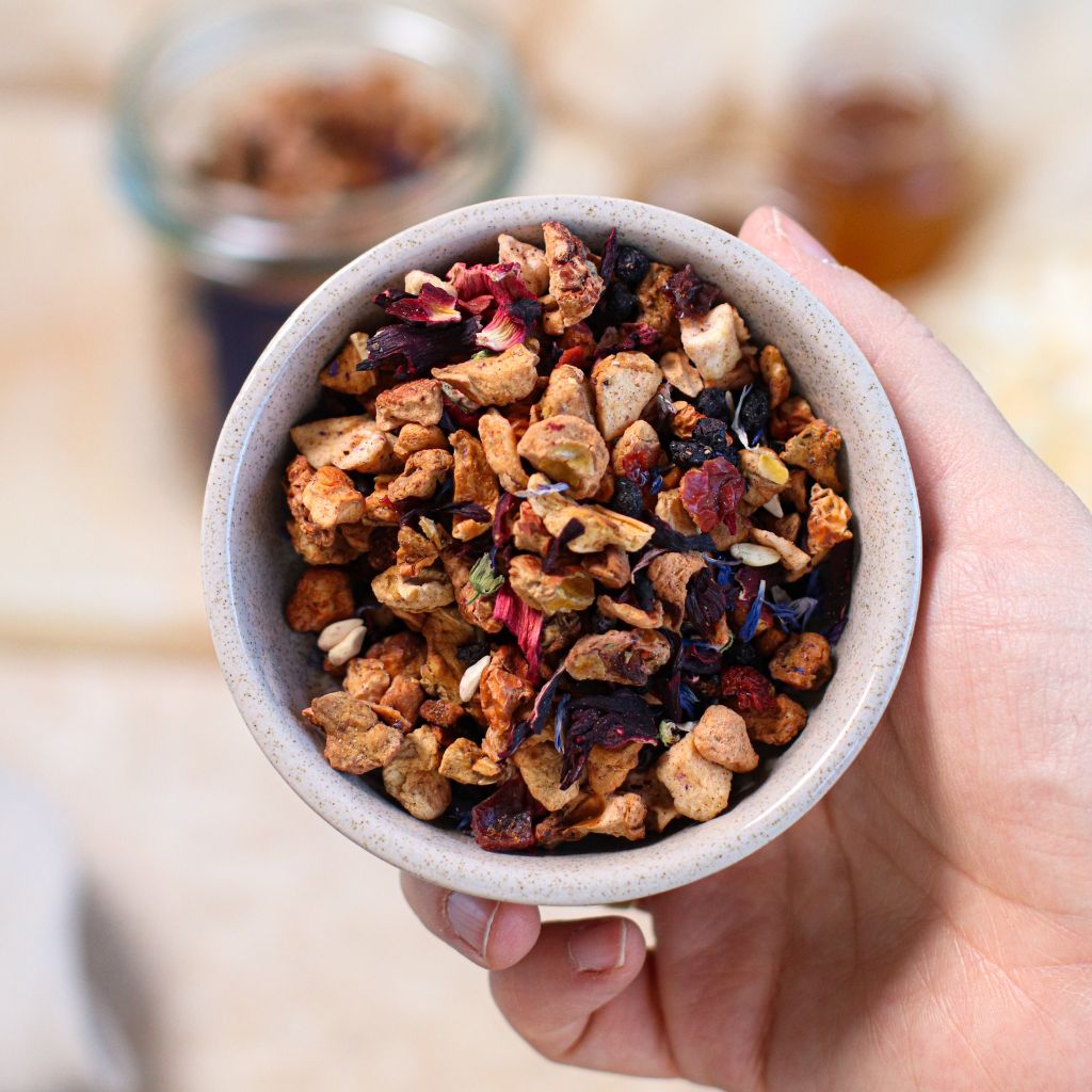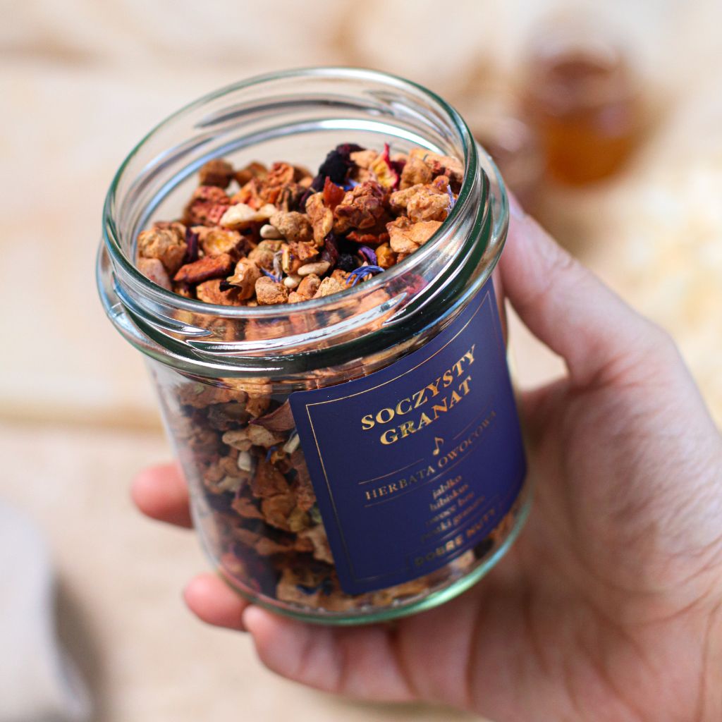 Skład: kawałki jabłek, kwiaty hibiskusa, owoce bzu, liofilizowane jabłka, pestki granatu, skórka dzikiej róży, aromat, borówki, kwiaty bławatka, kwiaty malwy.