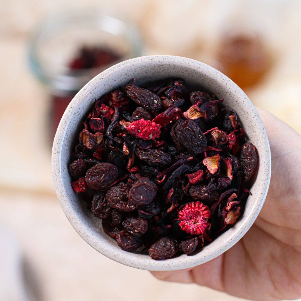 Skład: rodzynki sułtańskie, kwiaty hibiskusa, owoce bzu, aromat, liofilizowane jeżyny, liofilizowane maliny, liofilizowane truskawki, liście jeżyny, borówki, czarne porzeczki.