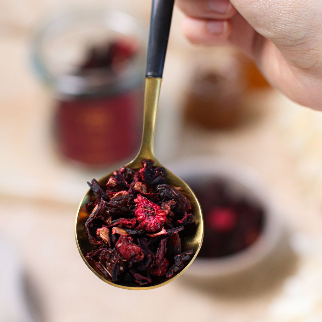 Rodzynki sułtańskie, kwiaty hibiskusa, owoce bzu, aromat, liofilizowane jeżyny, liofilizowane maliny, liofilizowane truskawki, liście jeżyny, borówki, czarne porzeczki.