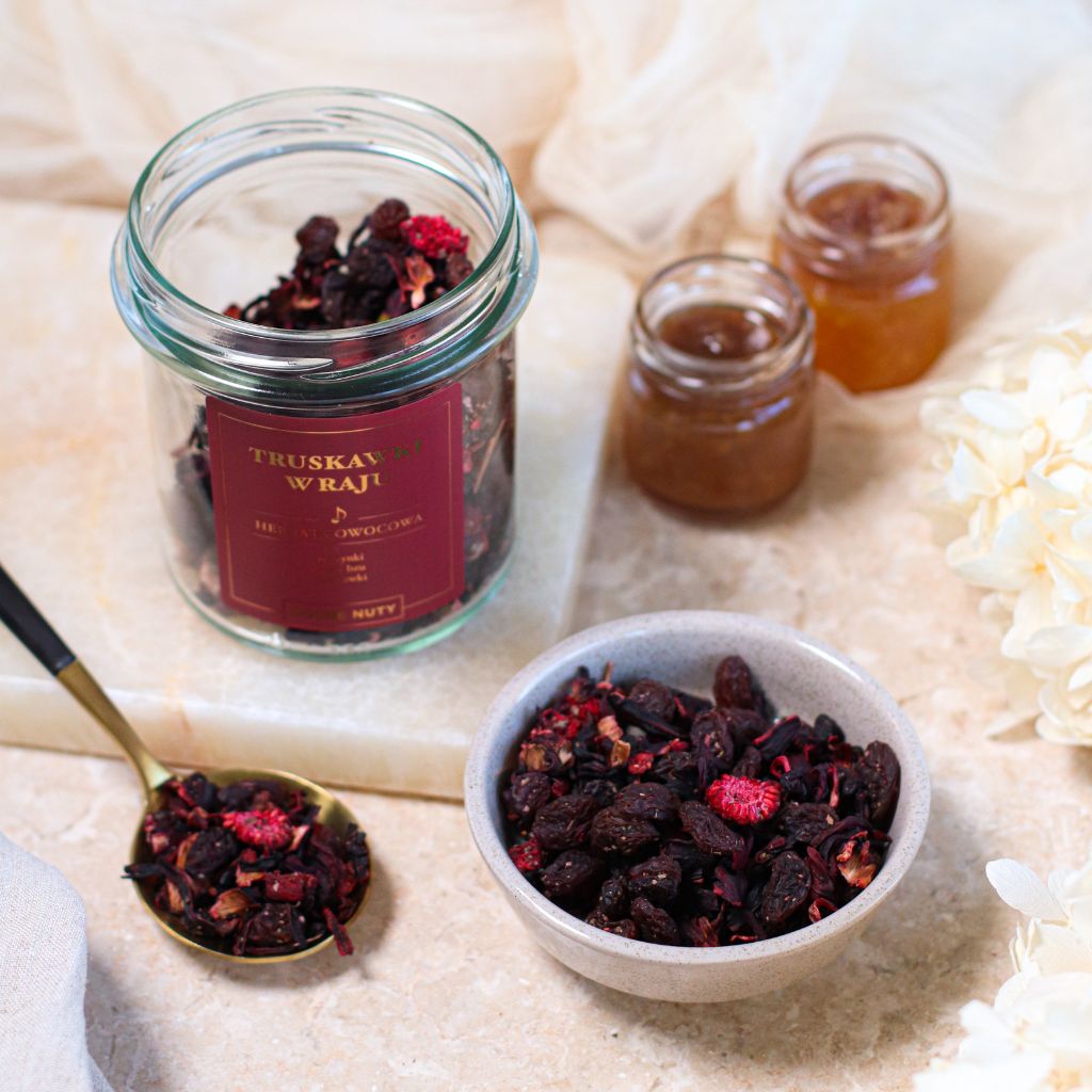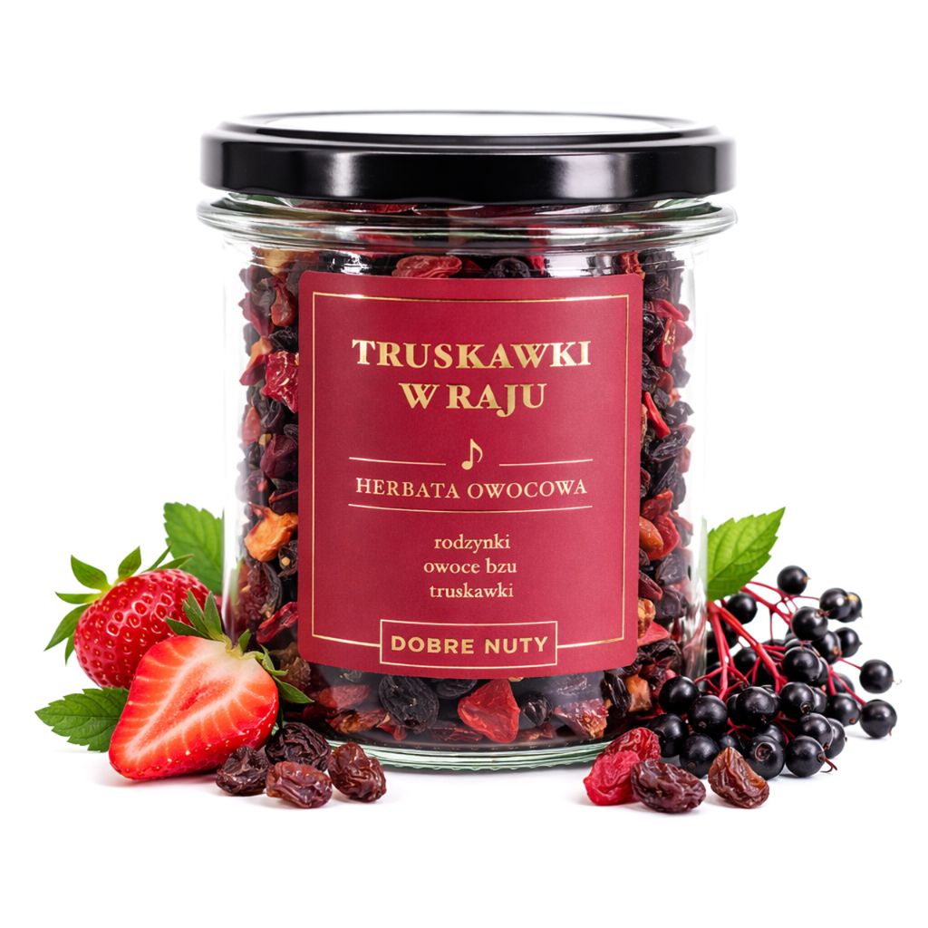 Truskawki w raju to prawdziwie deserowa kompozycja, która zachwyca intensywnym aromatem i naturalną słodyczą dojrzałych owoców. Na pierwszy plan wysuwa się soczysta truskawka, której towarzyszą maliny, jeżyny i inne owoce leśne, tworząc pełny, harmonijny smak o głębokiej, rubinowej barwie naparu.